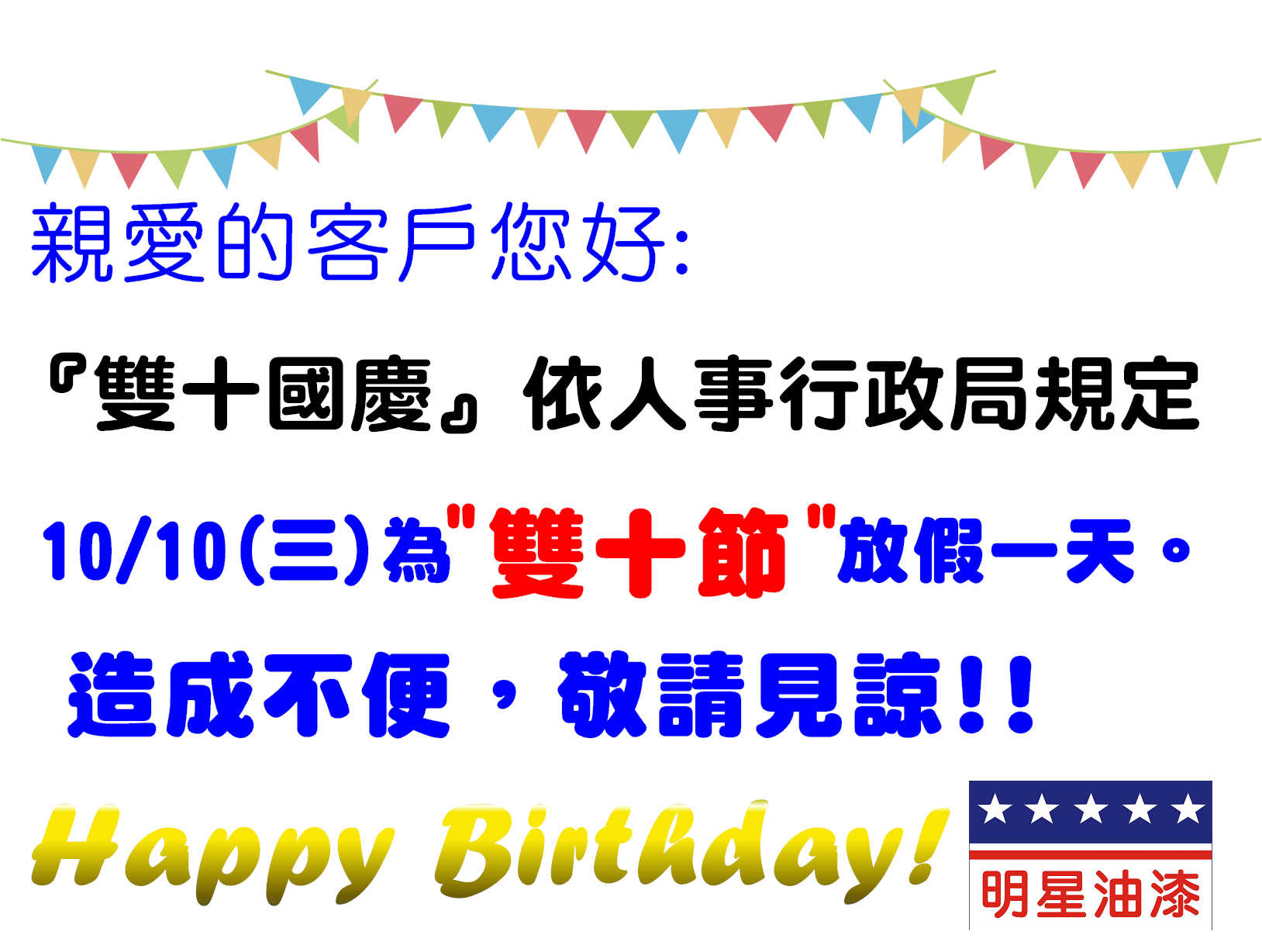 2018雙十節國慶日休假通知